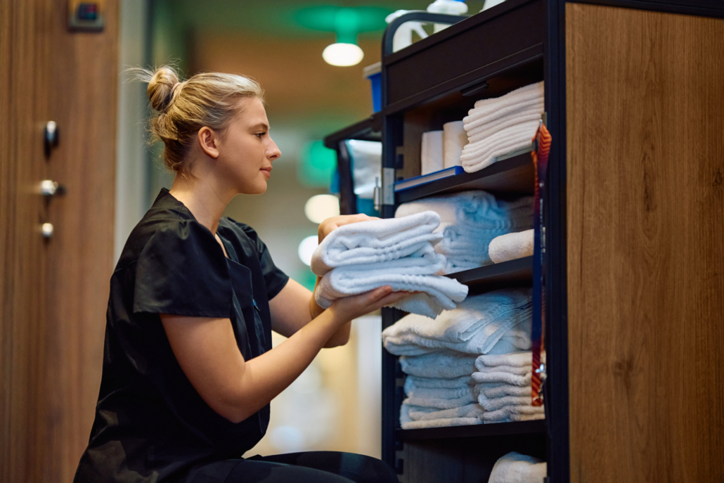 Young housekeeper taking clean towels from room attendants’ trolley while working in a hotel.